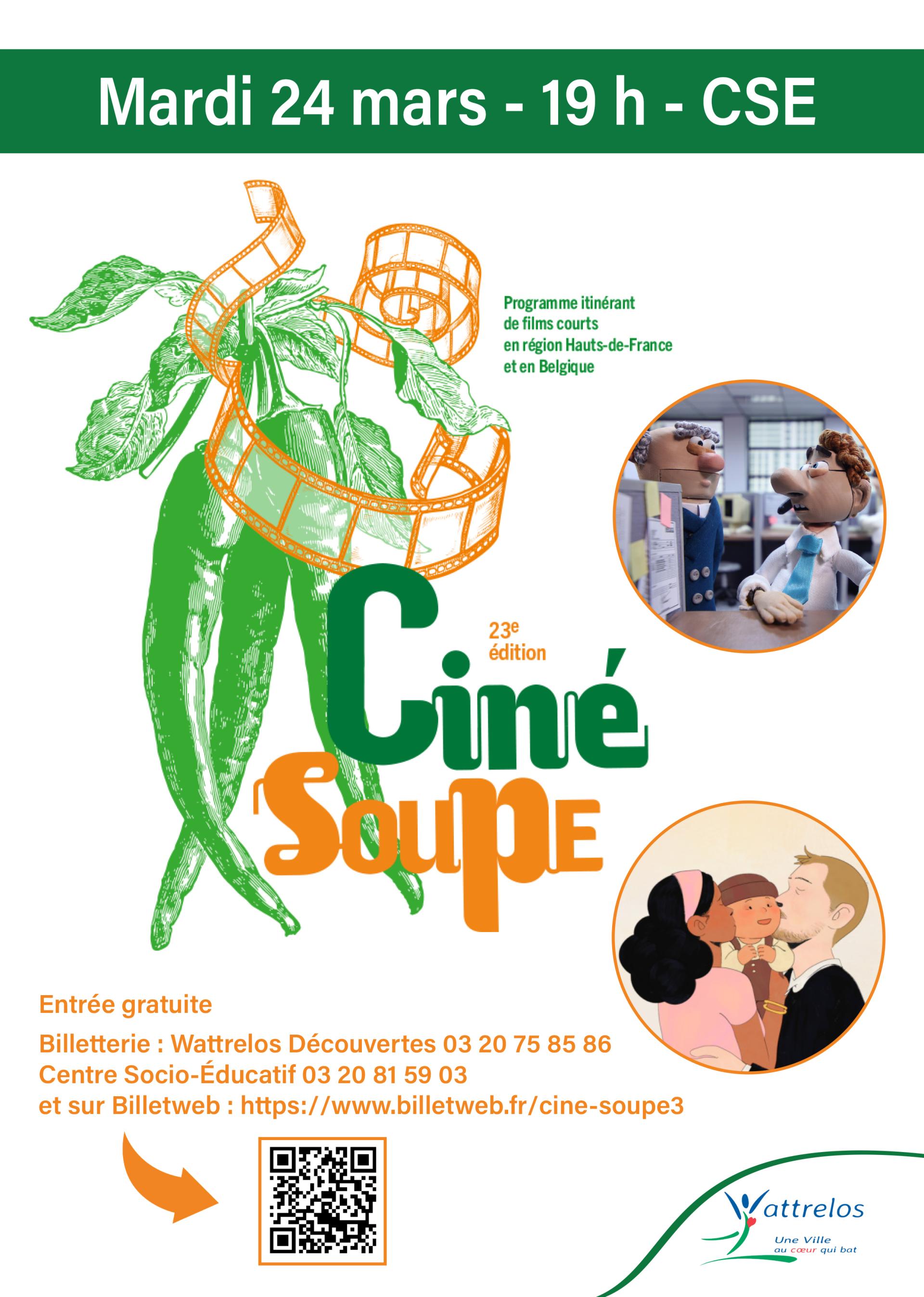Biilletterie : Wattrelos Découvertes au 03 20 75 85 86, Centre Socio-Educatif au 03 20 81 59 03 ou sur Billetweb : https://www.billetweb.fr/cine-soupe3