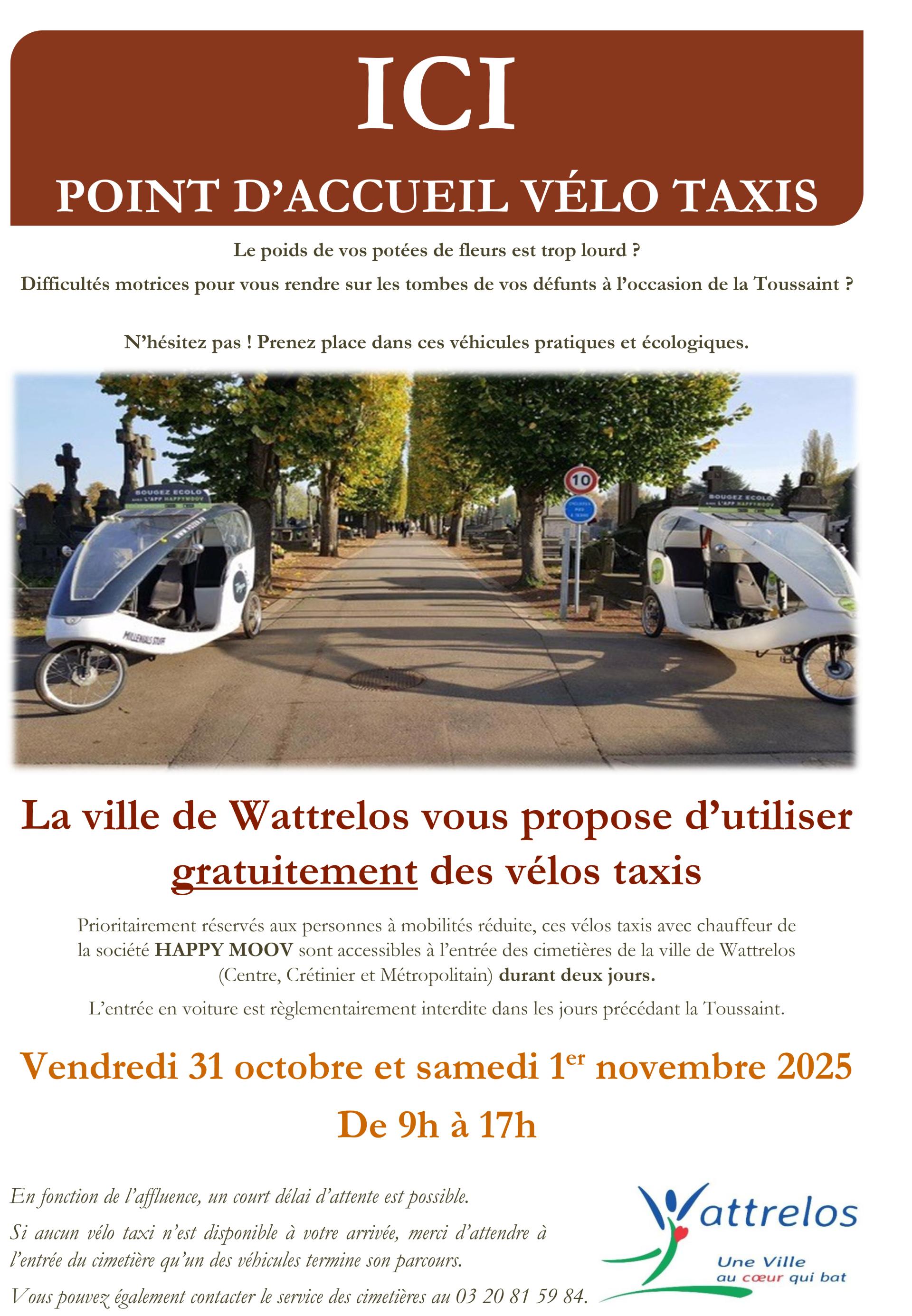Les vendredi 31 octobre et samedi 1er novembre, de 9 h à 17 h, la ville de Wattrelos vous propose d'utiliser gratuitement des vélos taxis qui seront prioritairement réservés aux personnes à mobilité réduite. Ces vélos taxis avec chauffeur seront accessibles à l'entrée des 3 cimetières de Wattrelos (Centre, Crétinier et Métropolitain) durant les deux jours.