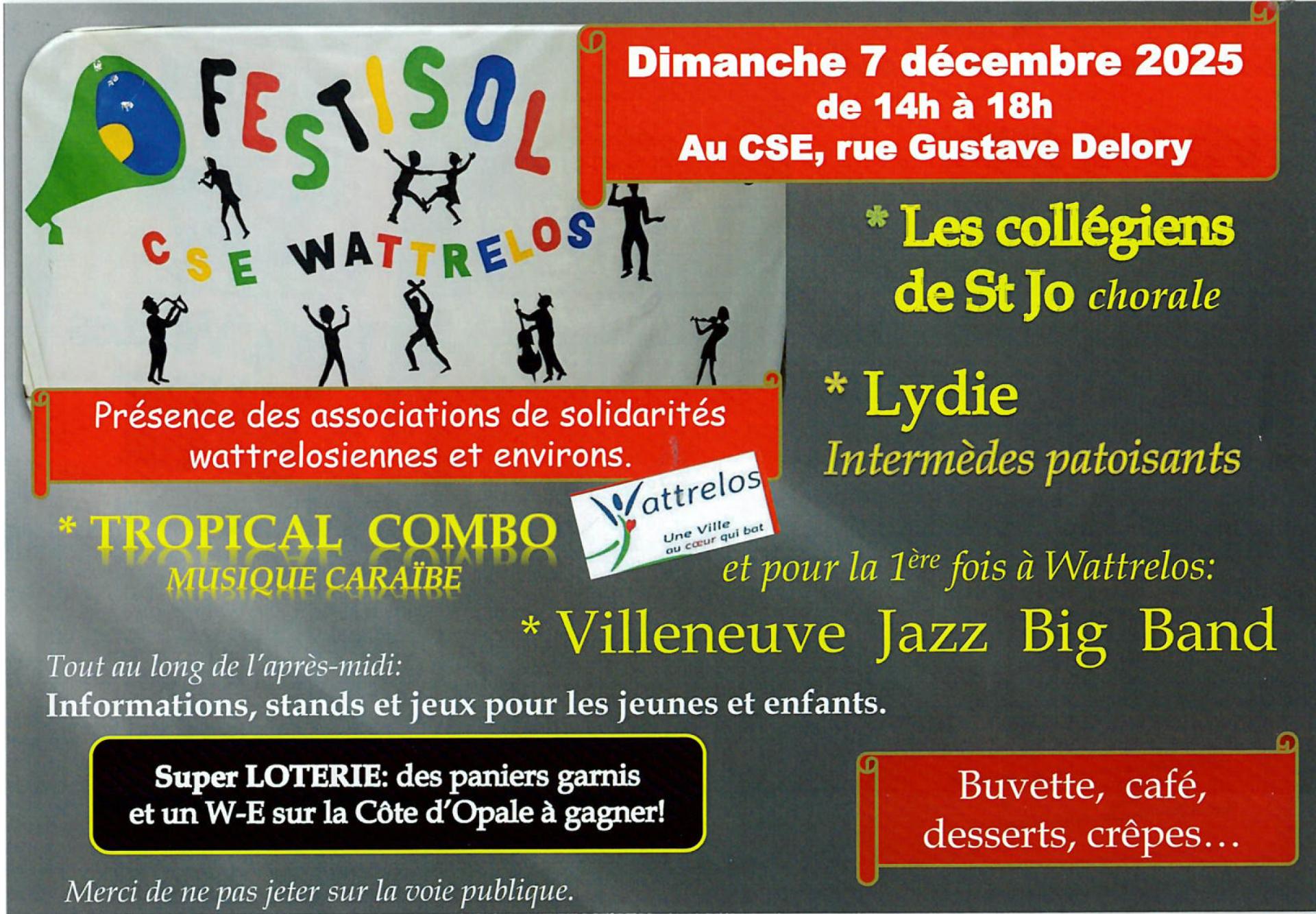 Le dimanche 7 décembre de 14 h à 18 h au CSE : FESTISOL, Festival des Solidarités. Ce temps-fort réunira nombre d'associations wattrelosiennes de solidarité tant locales, nationales qu'internationales, avec de nombreux stands d'informations et de vente d'objets artisanaux.Des animations musicales, chorales, folflores et un jeu de découverte pour les enfants égaieront toute l'après-midi qui se terminera pas un repas "auberge espagnole", partagé entre les associations.