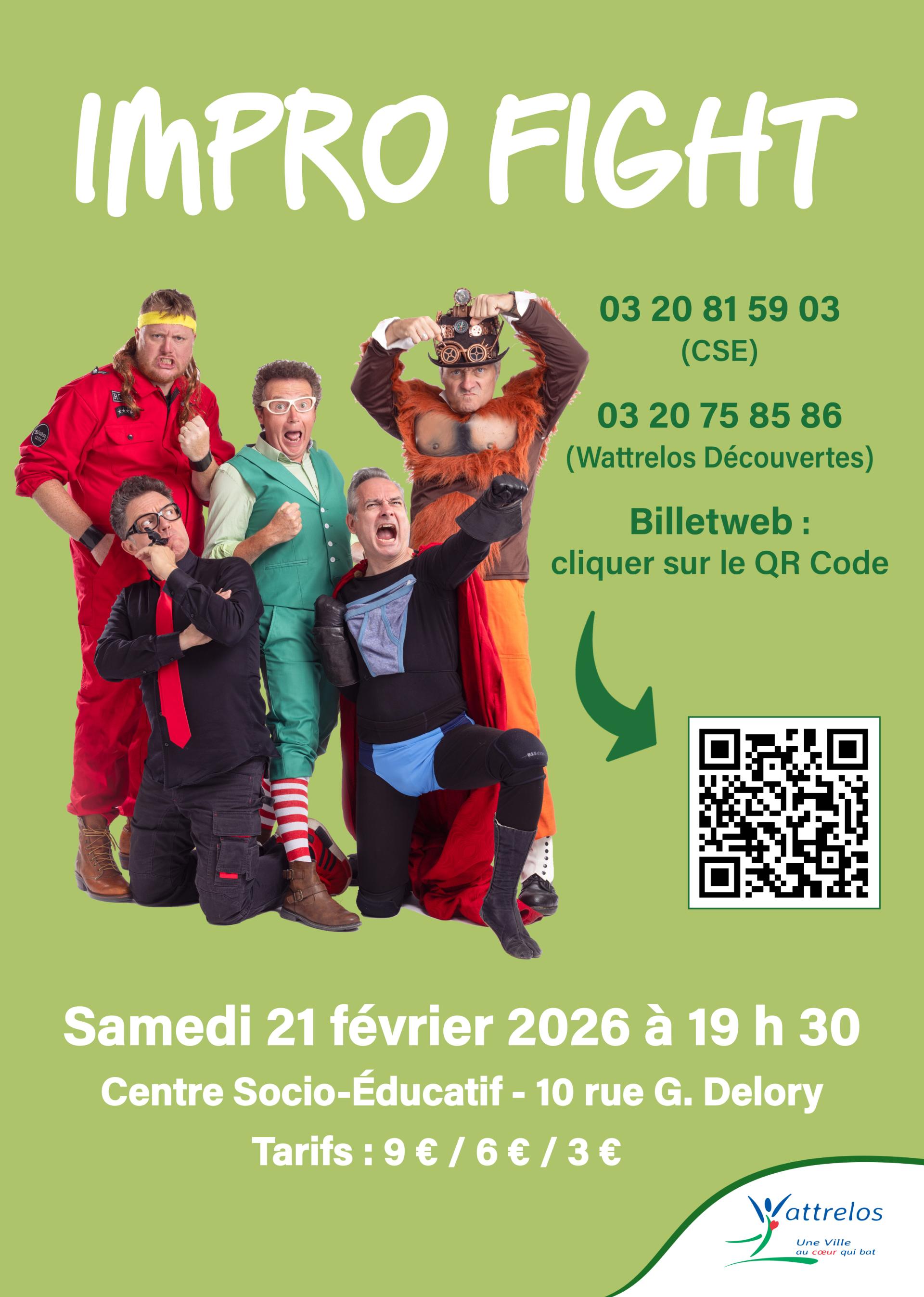 Impro Fight est un format d’improvisation basé sur les règles du catch d’improvisation.Le public décide de tout : les thèmes, les meilleures improvisations, et selon les catégories, il participe également à l’improvisation, soit en désignant des suites d’histoires, ou pour les volontaires, en s’impliquant sur scène avec la bienveillance des comédiens.A la fin de chaque saynète, chaque spectateur peut voter pour le meilleur des deux "fighters".Bien évidemment, celui qui récolte le plus de points remporte la victoire… À moins que l’impartialité subjective de l’arbitre en décide autrement !