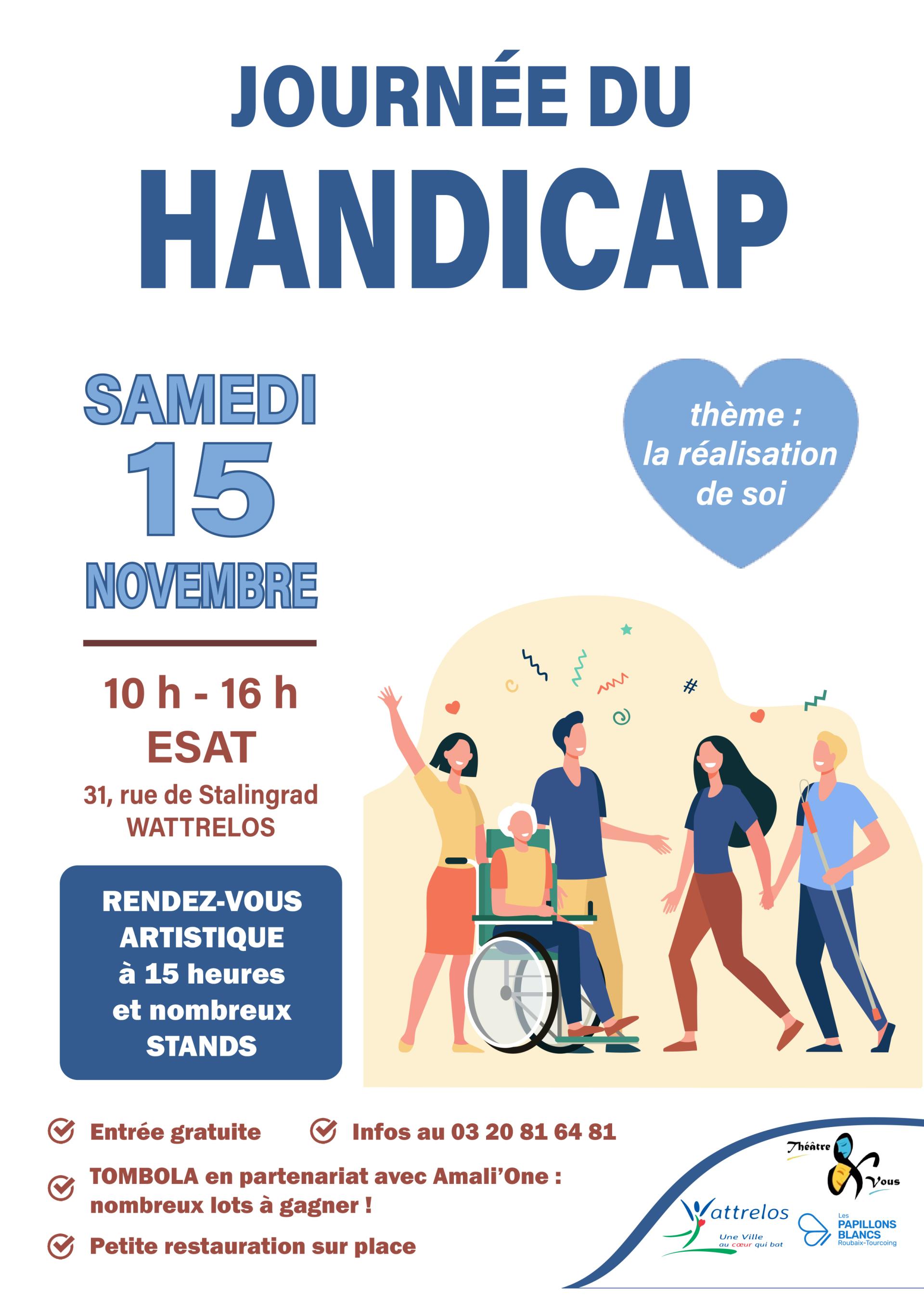 Journée du Handicap le samedi 15 novembre de 10 h à 16 h à l'ESAT, 31 rue de Stalingrad Rendez-vous artistique à 15 heures et nombreux stands.