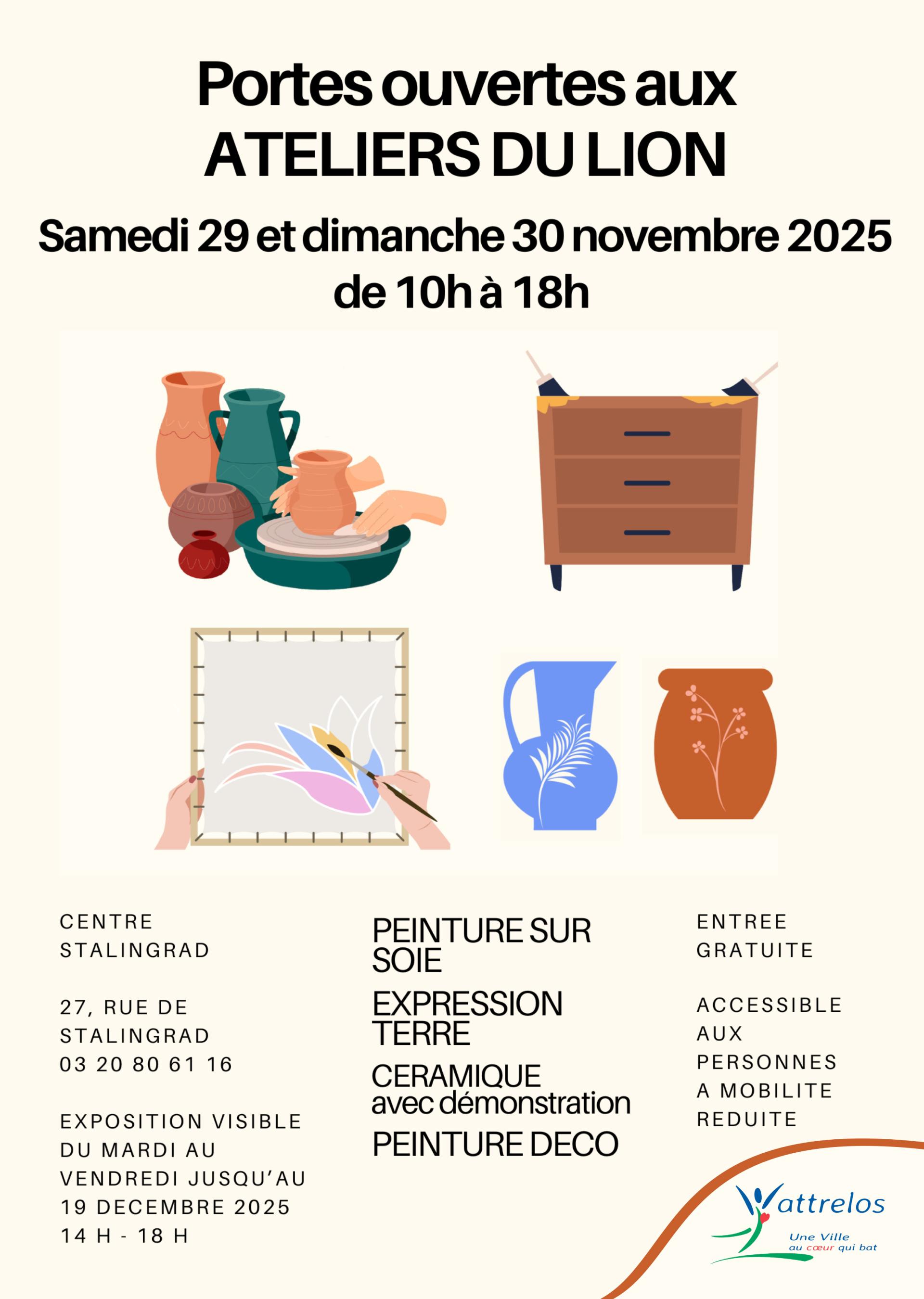 24ème portes ouvertes des Ateliers du Lion les samedi 29 et dimanche 30 novembre de 10 h à 18 h au 27, rue de Stalingrad : peinture sur soie, terre et céramique avec démonstration et peinture-déco.Entrée gratuite. Infos au 03 20 80 61 16.