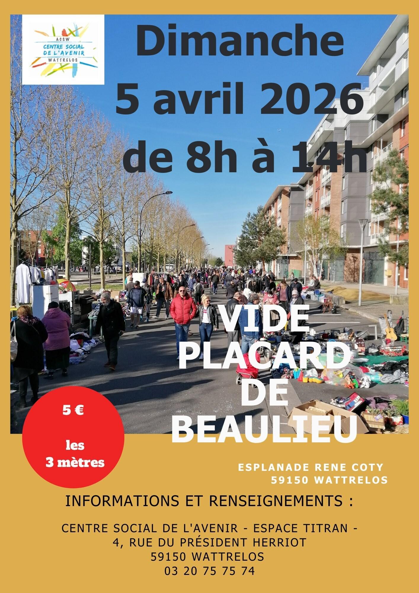 Vide-placard de Beaulieu le dimanche 5 avril de 8h à 14h.Informations et réservations au Centre Social de l'Avenir, Espace Titran, 4 rue du Président Herriot, 03 20 75 75 74.